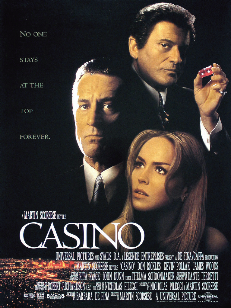 Casino has grossed nearly $120 million to date… with Robert DeNiro playing the fictional Sam “Ace” Rothstein and Sharon Stone as wife Ginger McKenna. Stone also won a Golden Globe Best Actress award and Oscar nomination for her performance.